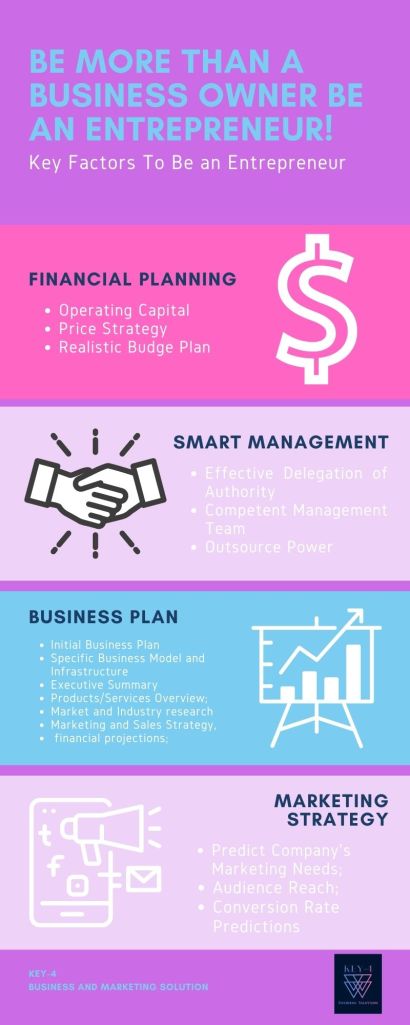 Financial Planning is the first key to success. Small businesses fail for many different reasons, starting with a lack of money or operating capital. Poor management skills are another reason for small enterprises failing followed by a lack of well-thought-out plans and more important do not design a marketing strategy.