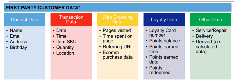 I would like to outline the types of data that companies collect. We can separate data into two different groups: First- Party Data which includes contact data; transactional data; web-browsing data; loyalty data; and others. Second and Third-Party data includes partnership data; audience data; aggregate data. Below you can find the type of data collected that was shared by Lia Grimberg during the interview.